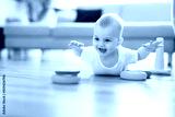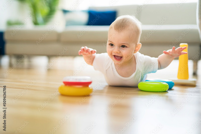 Cute 8 month baby laying on floor, playing with toys