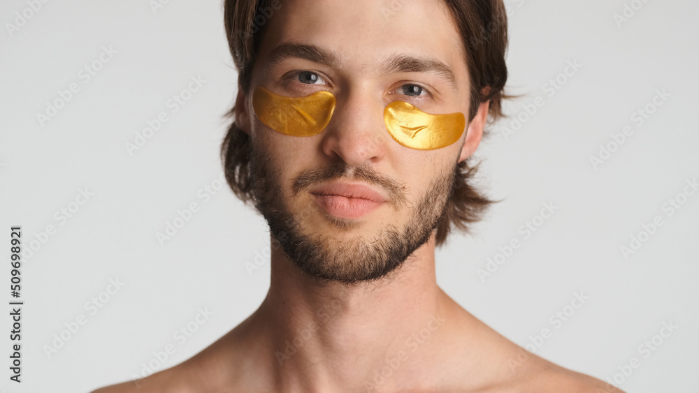 Handsome man applying gold patches under eyes looking at camera isolated. Attractive guy caring about his appearance