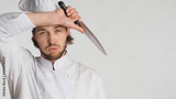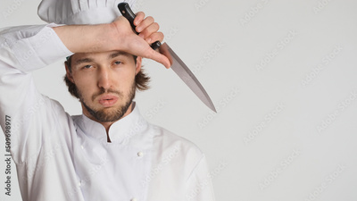 Close up male chef in uniform holding hand on head looking tired after hard day at work over white background