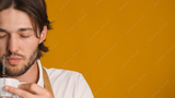 Close up male barista keeping eyes closed enjoying good coffee. Young bearded man holding cup of coffee with free space for your advertising content near isolated