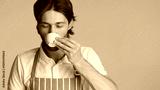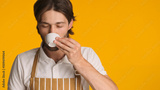 Handsome barista in apron drinking coffee closing his eyes in pleasure. Young bearded man enjoying good coffee over colorful background