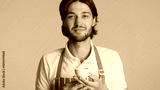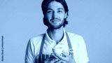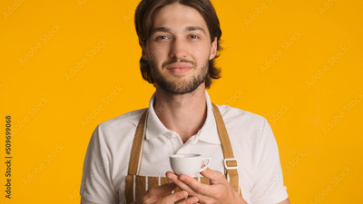 Attractive barista in apron holding cup of coffee looking at camera isolated. Young bearded man enjoying good coffee over orange background