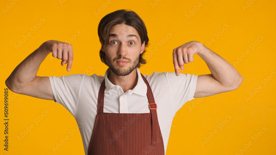 Astonished bearded man wearing apron pointing down with fingers looking amazed at camera isolated on colorful background. Young waiter posing in studio. Body language