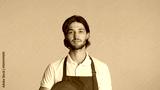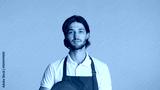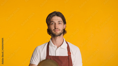 Young waiter looking at camera against a colorful background. Attractive bearded man in apron waiting order from customers