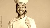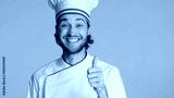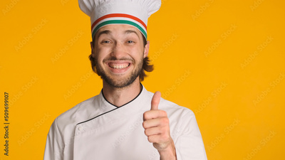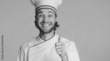 Young cheerful male chef dressed in uniform keeping thumb up smiling at camera over colorful background. Like it