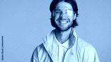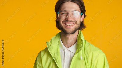 Portrait of handsome guy wearing transparent protective glasses and acid jacket sincerely smiling at camera over orange background. Cheerful bearded man in studio