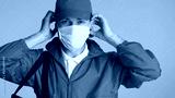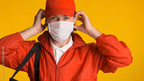Delivery man with face mask wearing red uniform looking confident isolated on yellow background. Male courier ready to work. Safety first
