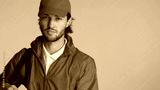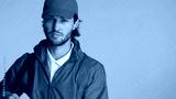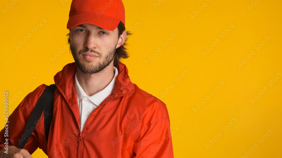 Portrait of bearded delivery man dressed in red uniform looking serious at camera over colorful background. Male courier looking confident near space for advertisement