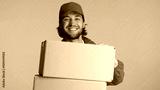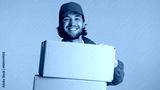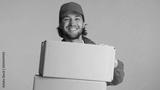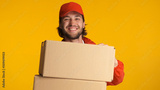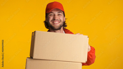 Beautiful delivery man wearing uniform holding cardboard boxes over colorful background. Male bearded courier enjoying his work standing with parcel boxes in studio