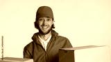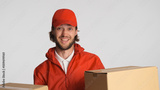 Positive delivery man wearing red uniform posing at camera with cardboard boxes in hands. Male courier standing with parcel boxes