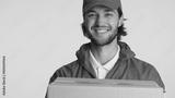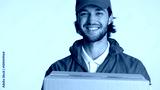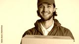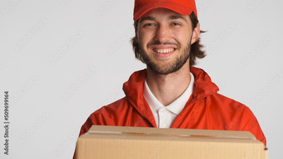 Portrait of delivery man holding parcel to customer at camera isolated. Attractive bearded male courier looking happy at work
