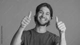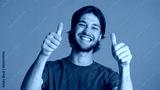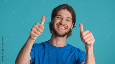 Cheerful bearded man keeping thumbs up showing like gesture and smiling at camera over blue background