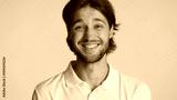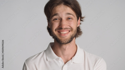 Portrait of smiling guy looking cheerful posing at camera over white background. Positive brunette man enjoying time with friends