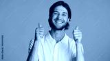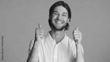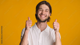 Cheerful brunette man keeping thumb up over colorful background. Handsome guy sincerely smiling at camera showing like gesture against colorful background