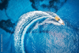 Aerial view of the speed boat in clear blue water at sunset in summer. Top view from drone of fast floating yacht in mediterranean sea. Travel in Oludeniz, Turkey. Tropical landscape with motorboat