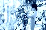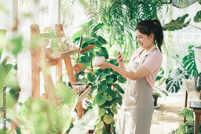 Smiling young woman taking smartphone picture of plant in a small shop