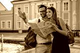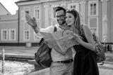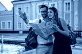 Portrait of happy couple having fun on vacation. People travel happiness concept.