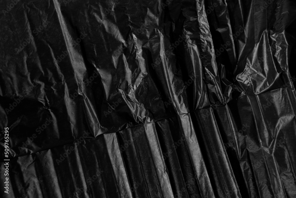 Top view closeup Creased single use or non recyclable black color shiny plastic trash bag made from polyethylene texture background
