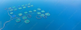 Aerial drone ultra wide panoramic photo with copy space of sea bass and sea bream fishery or fish farming unit in Mediterranean calm deep blue sea