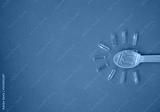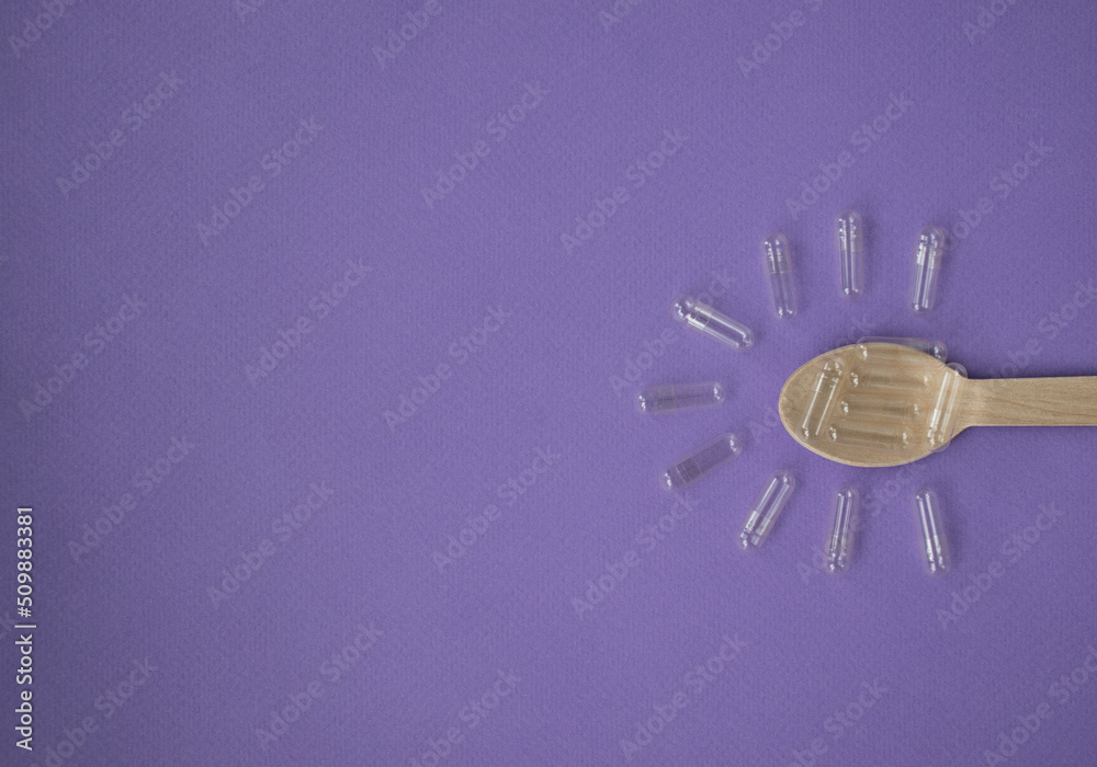 Empty Capsules in a Wooden Spoon on a Purple Background with Space for Copying Inscriptions.