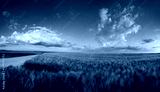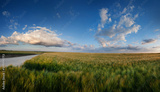 agricultural land with a field of rye in the evening light, blue sky and clouds