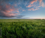 green ears of rye in the field and a beautiful purple pink cloud of the evening sky
