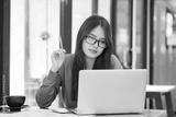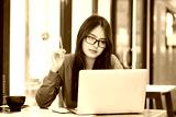 Young female college student uses a computer to access the Internet for online learning.
