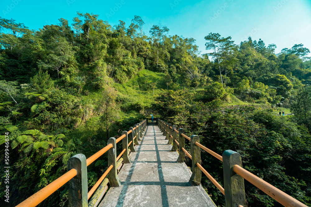 Iconic bridge in one of the tourist destinations in Kali Kuning, Sleman, Indonesia with green hills in the morning