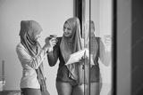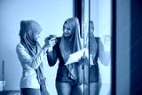 Two muslim women drinking coffee while discussing ideas on sticky notes on windows to plan a marketing strategy in meeting room.