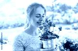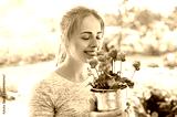 farming, gardening and people concept - happy young woman smelling pink cyclamen flowers in pot at summer garden