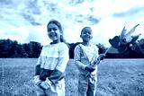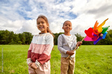 childhood, leisure and people concept - happy little boy and girl playing with pinwheel at park