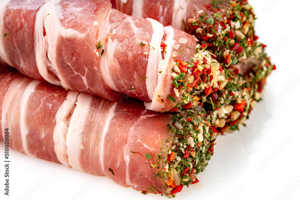 Bacon-wrapped meat roll with spices and herbs. Jamon pork, prosciutto, or presunto meat products, tartare meat inside. Meatloaf high focus view