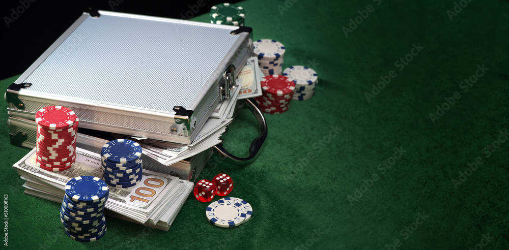 Gambling Briefcase Full of Money Cash, jackpot, casino chips. Suitcase with dollars, poker chips. Metal cash box Container stuffed with Paper currency, Casino tokens, gaming chips, checks, or cheques