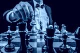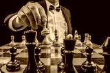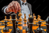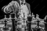 Chess Grandmaster, chess player. Мan in an elegant formal suit playing chess at a chess tournament. Old-fashioned chess pieces on a retro chessboard