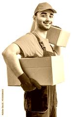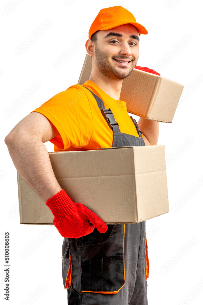 Delivery man with a box. Staff laborer in uniform-cap, t-shirt, coveralls service moving delivering orders goods. Guy holding cardboard package. Character on isolated white background, mockup design