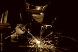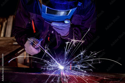 Arc welding. The welder works with an electric welding machine. Sparks of red-hot metal scatter in the dark. Worker holding electrode clamp, wearing a protective mask, helmet and gloves
