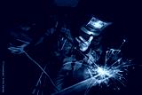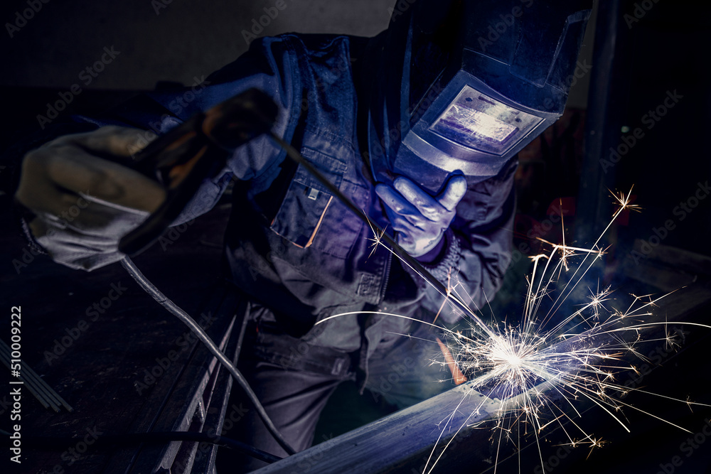Arc welding. The welder works with an electric welding machine. Sparks of red-hot metal scatter in the dark. Worker holding electrode clamp, wearing a protective mask, helmet and gloves