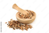Saw palmetto herb used in herbal plant medicine to treat impotence, low libido, prostrate problems, toothache, muscle waste and fatigue. Natural health care concept on white background.