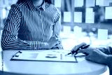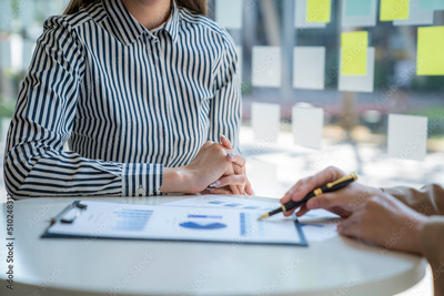 Analysis, Discussion, Asian woman economist and marketer pointing to a financial data sheet to plan, Negotiation