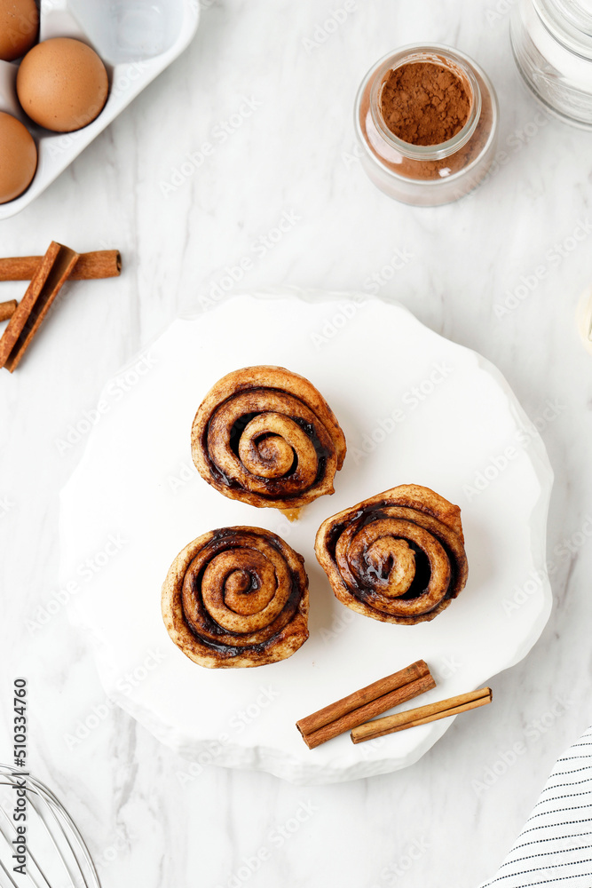 Beautiful Fresh Cinnamon Rolls Close Up on White Table. Fragrant Homemade Cakes