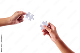 Close up hand two people holding jigsaws connecting puzzle elements on white isolated background