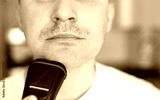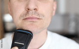 close up of caucasian man in white t shirt is shaving beard with electric razor at bathroom at home. copy space. mans beauty concept. morning routine