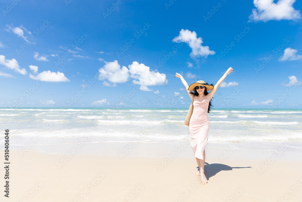 woman with casual clothes and raise arms pose for showing the shy on the beach