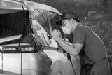 Car detailing and polishing concept. Professional car service male worker with orbital polisher, polishing silver car in auto repair shop