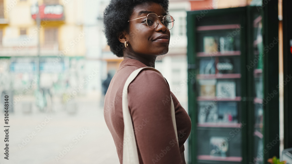 Beautiful brunette woman looking dreamy outdoors, wearing glasse