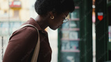 Beautiful brunette woman looking dreamy outdoors, wearing glasse