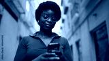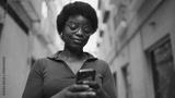 Young Afro girl wearing glasses texting on a smartphone. Female