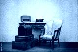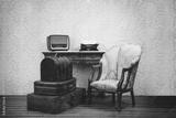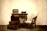 Set of old vintage suitcases, typewriter, armchair and radio.