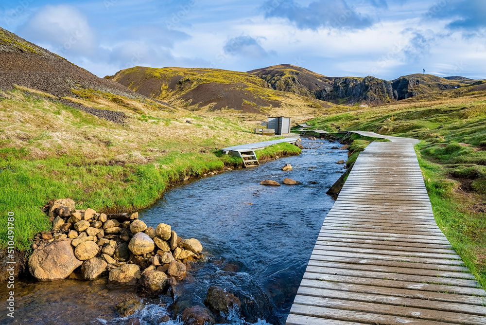 Wooden boardwalk by hot river stream against sky. Scenic view of natural geothermal bath in Reykjadalur valley. Beautiful scenery of grassy landscape against mountains in Hveragerdi.