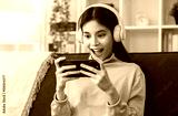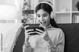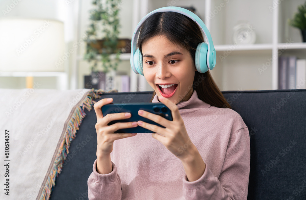 Excited Young Asian woman playing an online game on a smartphone with fists clenched celebrating victory expressing success.